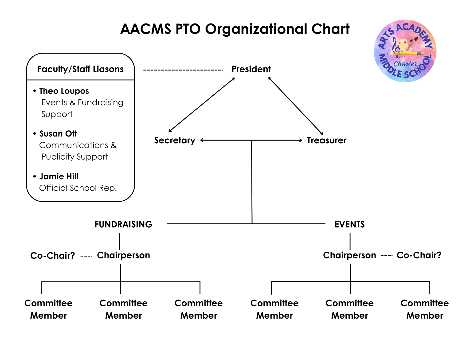 PTO stands for Parent Teacher Organization. Here at AACMS, we recognize that parental & family involvement is crucial to success of our students and our school. Our PTO is open to ALL Parents, Guardians, & Caregivers in our school community. We meet the first Tuesday of every month, subject to change based on the needs of the group, but all changes will be publicized here, on social media, and in our newsletter. We exist primarily to help run Events and Fundraisers that benefit our students. The structure of our PTO is below. Click on the image to view a full-sized PDF.